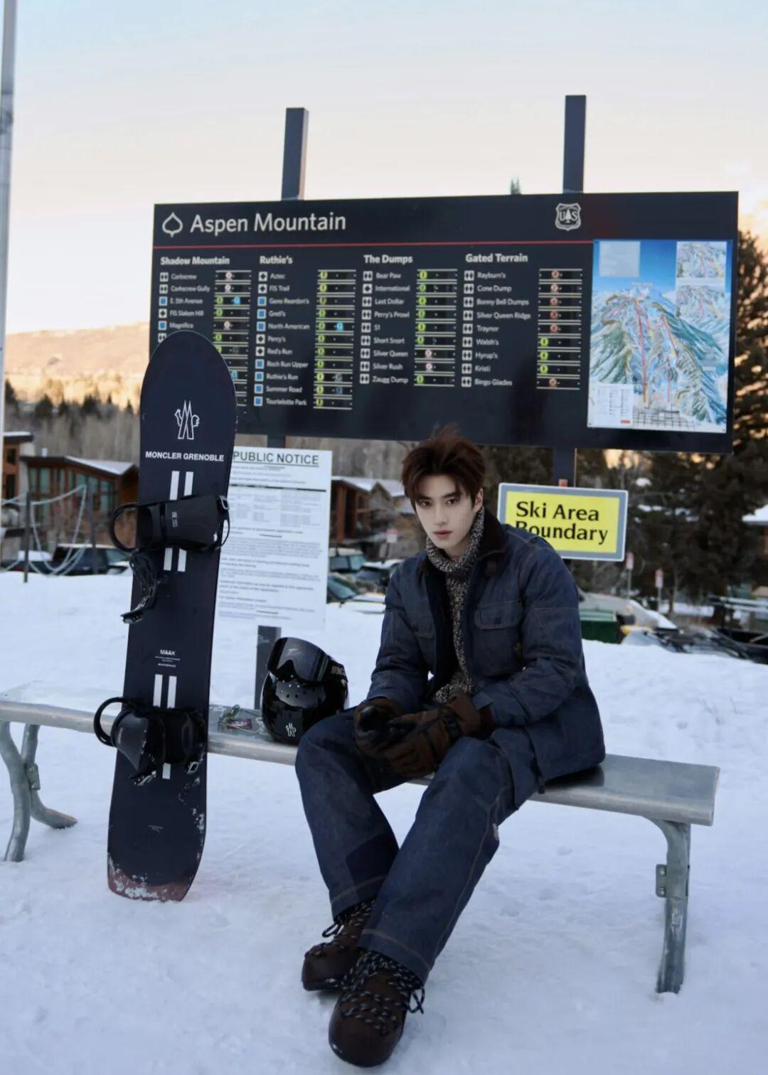 张乐康身着牛仔雪服,内搭针织毛衣,随性又不失质感。同色系棕色雪靴与手套相互呼应,将冬日运动穿搭的舒适与格调完美融合。